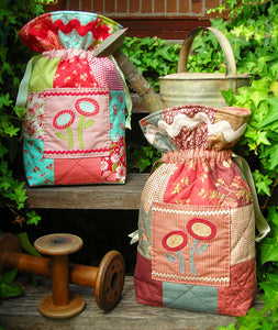 Sally's designs feature machine piecing with applique and hand embroidered flowers, birdies and more. Pretty embellishments such as ric rac and pom pom braid complete the designs.