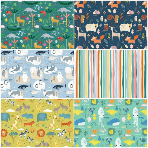 Stellar from Rashida Coleman-Hale is a celebration of all things starry. This joyful collection in shades of coral, pink navy and gold with metallic gold highlights is sure to bring a smile to your face. The painterly stripe fabrics from her "zip" collection bring it all together, adding texture and dimension to this fun range.